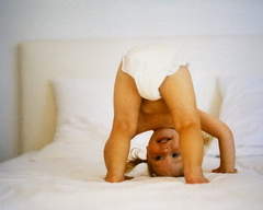 «Кошка» (или приседания с поворотом)Ребенок становится прямо, ноги ставятся уже, чем ширина плеч, и делает легкие приседания (не отрывая при этом ступни от пола) и вместе с тем поворачивает туловище вправо. Выполняет резкий вдох. Поворачивается таким же образом влево - резкий вдох. Следите, чтобы ребенок при этом упражнении не приседал слишком глубоко. При этом его руки должны захватывать воздух точно так же как в упражнении «Ладошки». Подряд нужно делать 32 вдоха, затем отдых три-четыре секунды, и вновь 32 вдоха.
