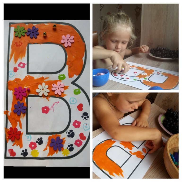 Украшали букву всем, что попалось под руку. В начале идея была закрасить ее пластилином, но Ане быстро надоело...