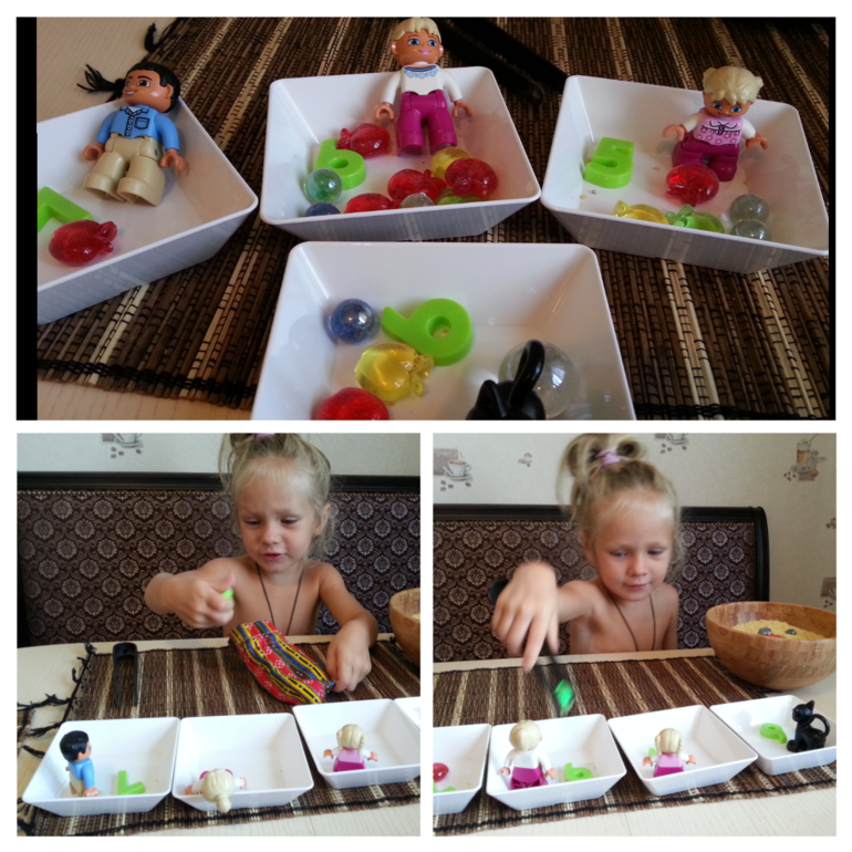 Из мешочка достает цифру, называет ее и дарит героям. Затем щипцами из крупы достает шарики и яблочки, кладет нужное количество к героям.