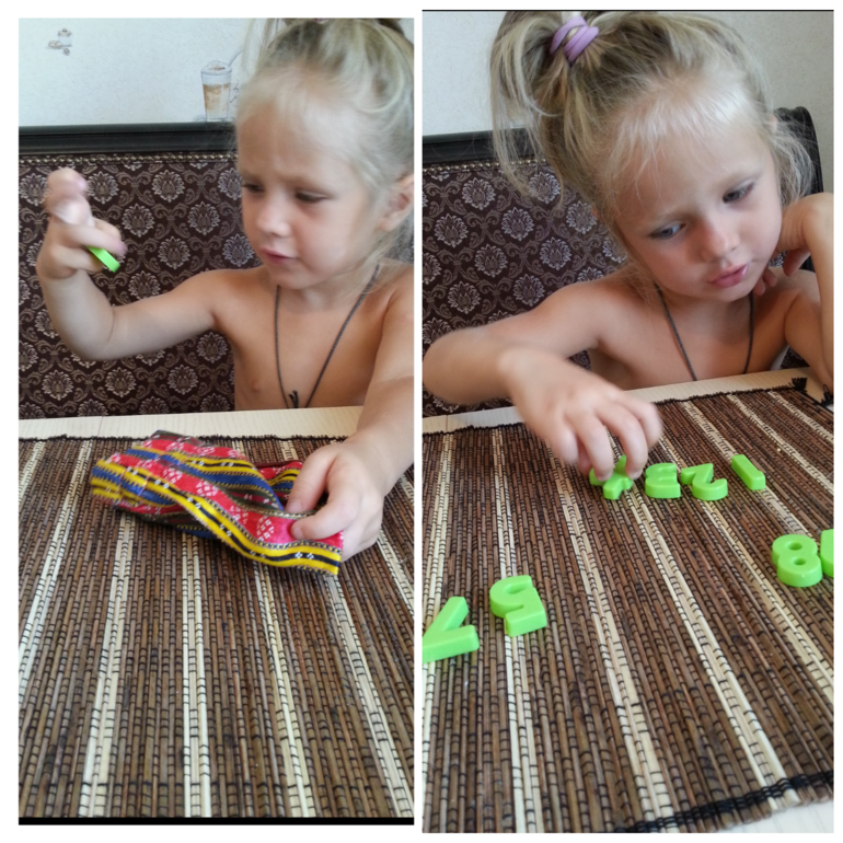 Снова из мешочка достает, называет, а потом раскладывает в правильной последовательности.