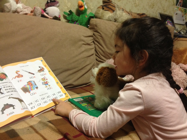 Играем, как будто бы она привела в школу щенка и он учится читать. Я учитель, прошу щенка прочитать слоги. На что Ленок мне заявляет, что она будет читать за него (он же игрушечный), а я ей серьезно так говорю, - ты только изображай его другим голосом, но чтобы было похож на щенячий))) Ура! Читала слоги в скучном букваре и довольно много, долго и все с удовольствием! (правда щенячьим голосочком)))