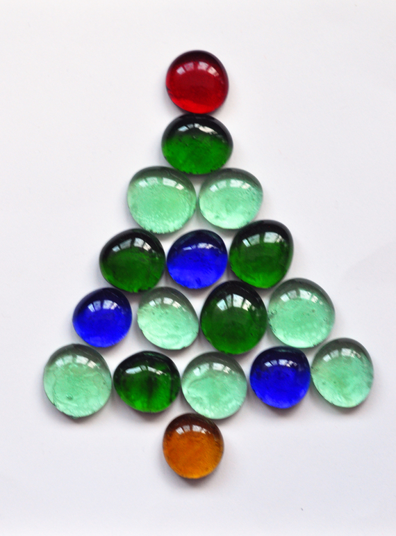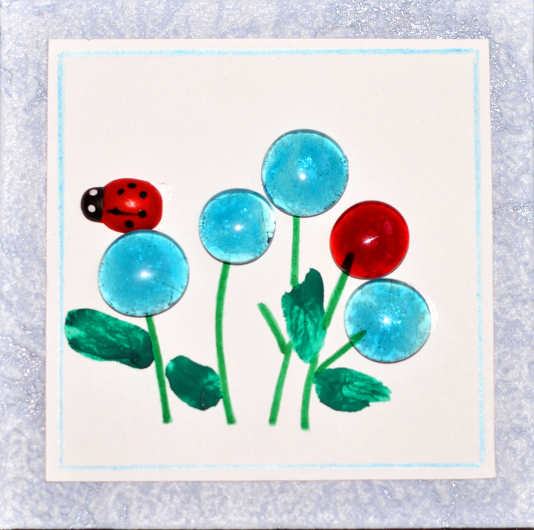 А вот аппликации из разноцветных стеклянных камушков. По-моему, получилось очень мило и празднично. Елочку делали к Новому году, а цветочки в подарок бабушке ко Дню рождения.
