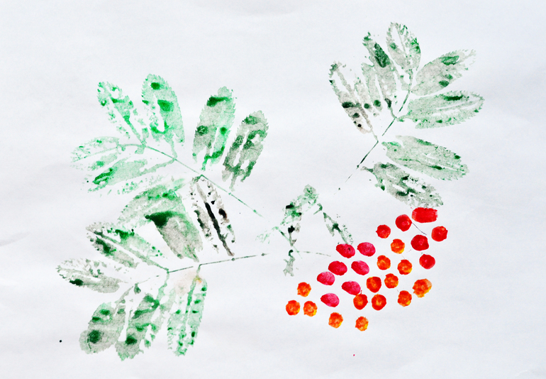 Отпечатки. Полюбили мы эту технику рисования. Рябинку делали так - красили краской листья рябины и делали отпечатки на бумаге, я помогала прикладывать, чтоб было аккуратней. Затем мы брали ватную палочку, окунали в краску и рисовали ягодки.