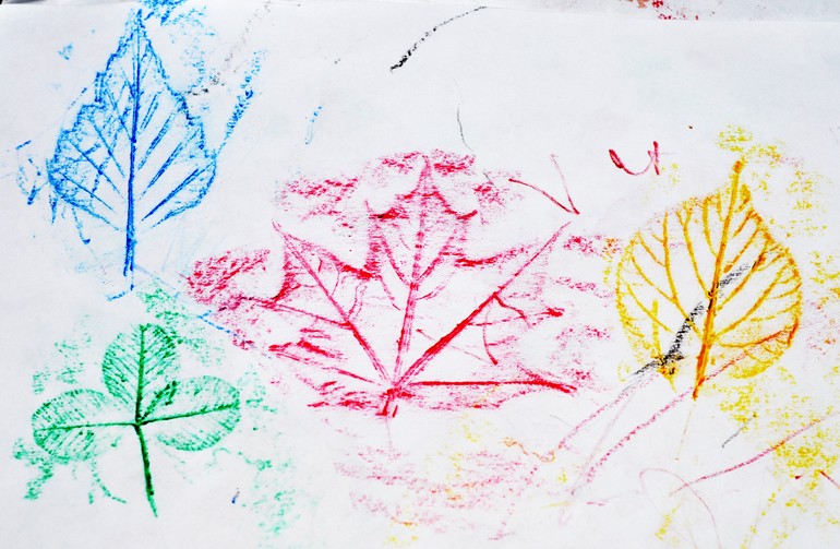 А еще отпечатки можно получить другим способом. Взять текстурные элементы, подложить под листок бумаги и закрасить обычными цветными или восковыми карандашами. Мы таким образом получили отпечатки листьев.