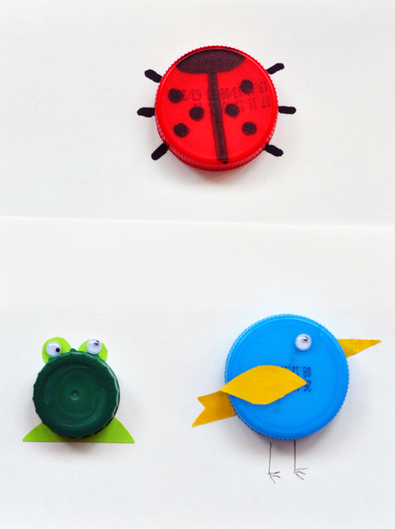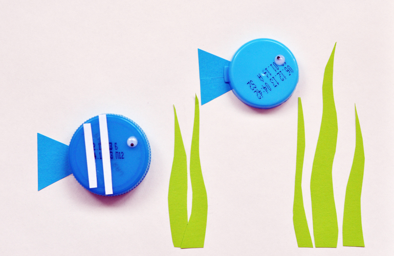Накопилась у нас куча разноцветных крышек, мы решили и из них что-нибудь придумать. Получились забавные птицы, насекомые и рыбы. Все детали аппликации я вырезала заранее, Тима мазал клеем и клеил. В дело пошли глазки, оставшиеся от какого-то набора для декорирования яиц, но их можно купить и в различных магазинах для творчества и рукоделия.