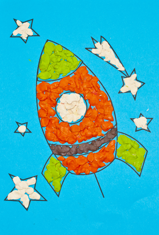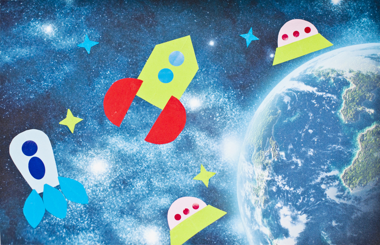 Космос делали так. Я нашла в интернете и распечатала понравившееся мне изображение космоса, вырезала из цветной бумаги детали космических кораблей, затем мы с Тимой наклеили их на изображение. Мелкие детали - окошки или иллюминаторы - это случайно обнаруженные наклейки, остатки от какой-то развивающей книжки.