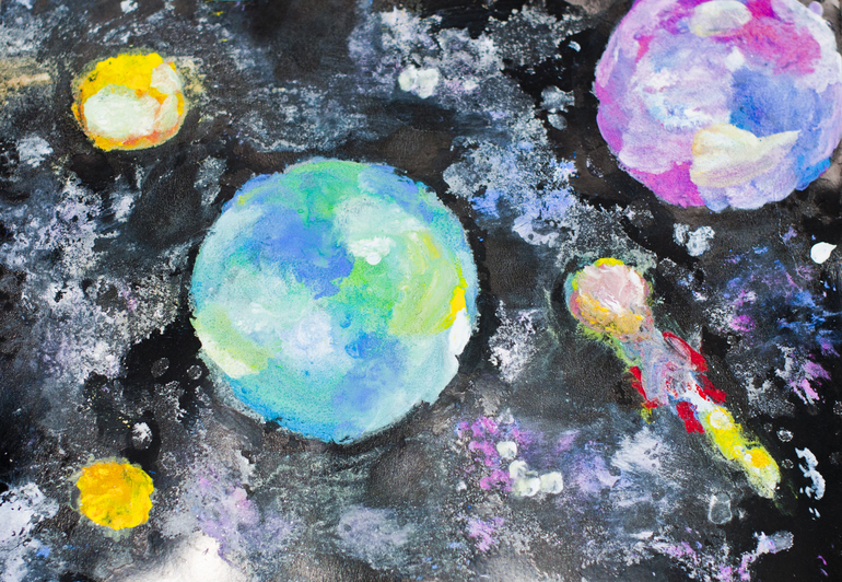 К дню космонавтики мы творили на тему космос - рисовали планеты гуашью, затем мочили бумагу и обильно посыпали солью, после высыхания, на бумаге остались вот такие белые разводы - имитация звездного неба.