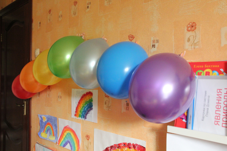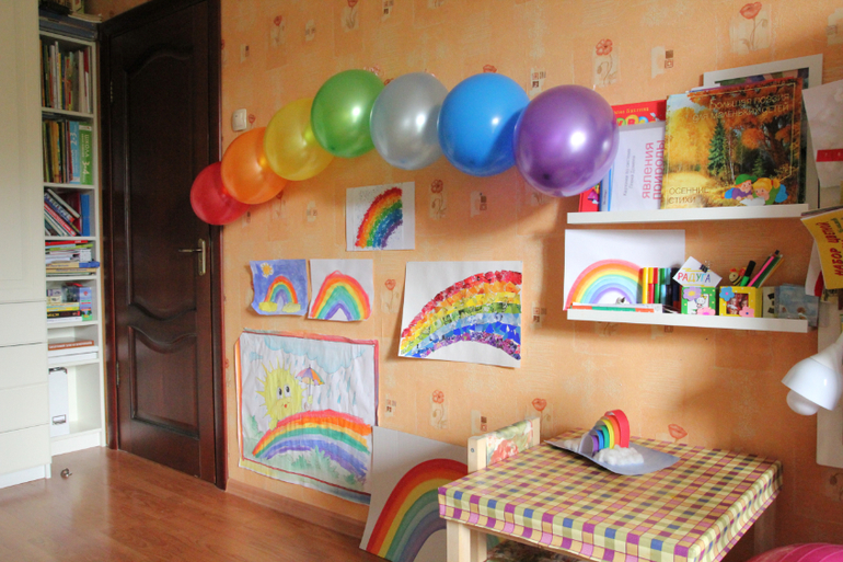 Сюрприз для Анастасии - повесила семь радужных шариков. (Покупала в Затее, по 6р/шт). И выставка (как говорит Настя) наших работ.