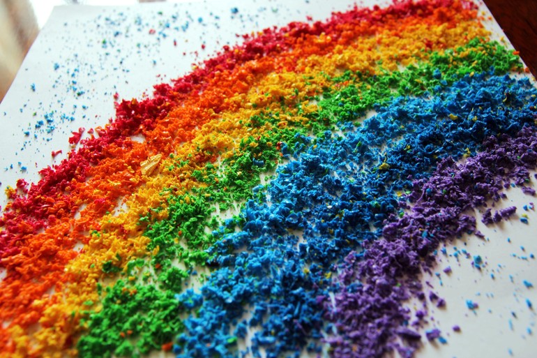 4. и дать ребенку поочередно заполнять каждую полосочку дуги нужными по цвету стружками. Это очень весело!