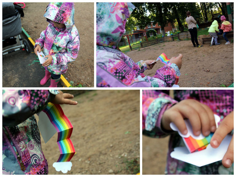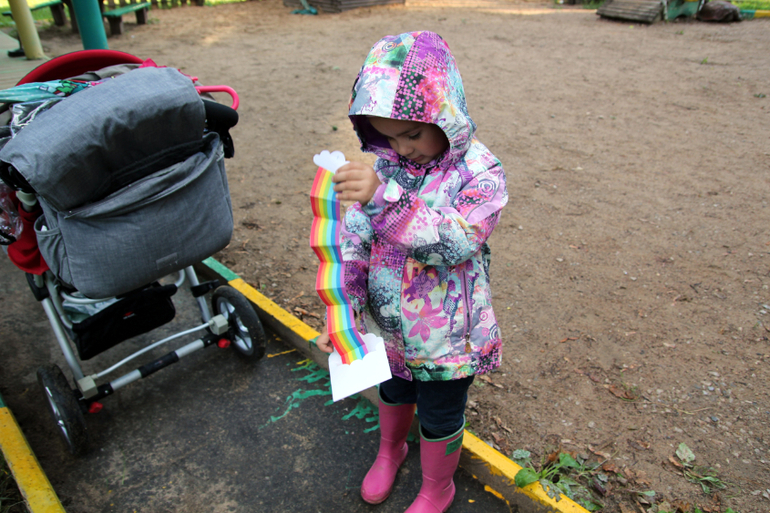 Оборотную сторону самой радуги я "заламинировала" скотчем. Всем советую, у нас держится уже месяц.