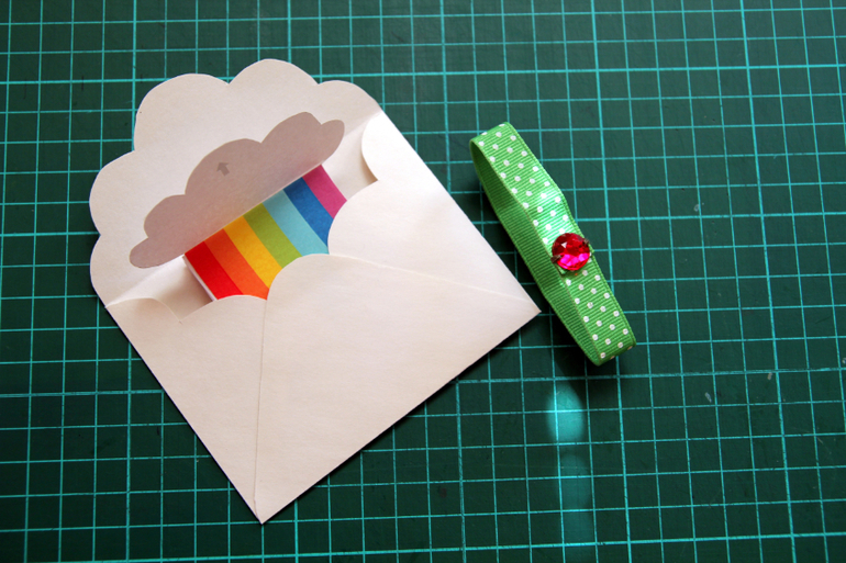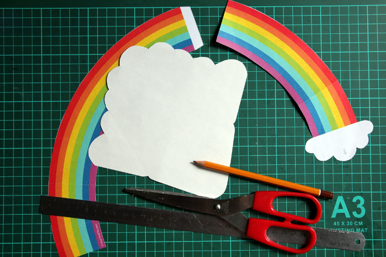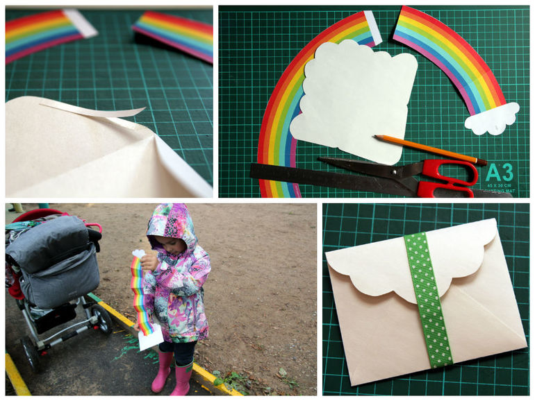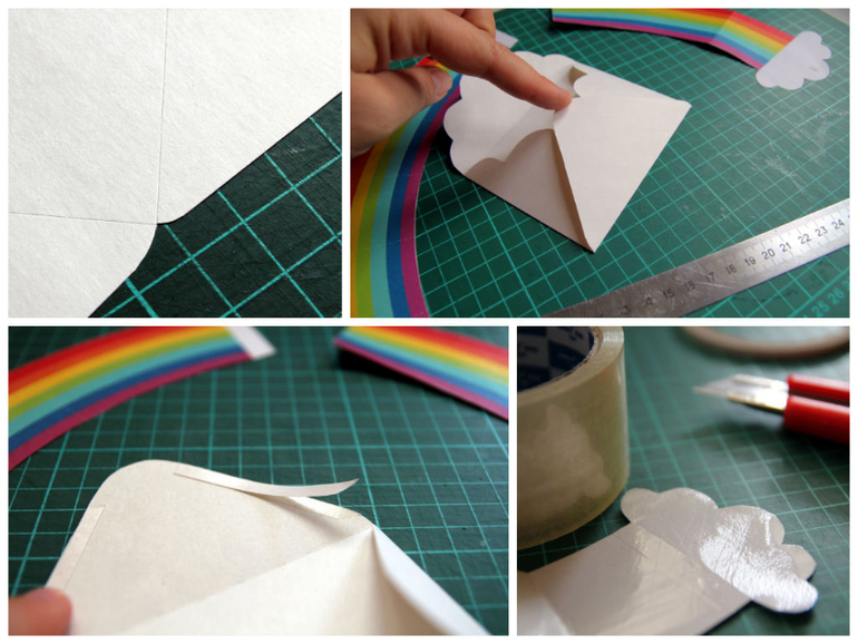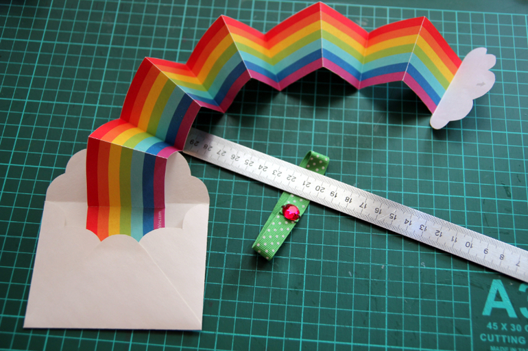 Распечатываем, вырезаем по шаблону заготовку для конверта (из плотной бумаги) и две детали радуги.
