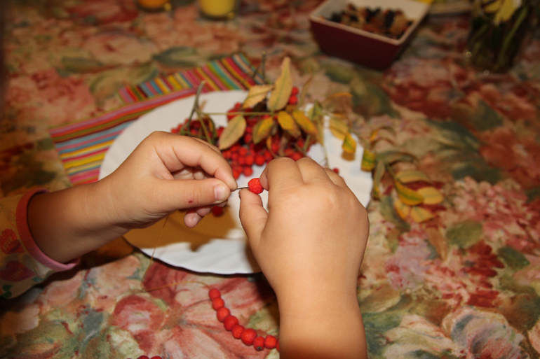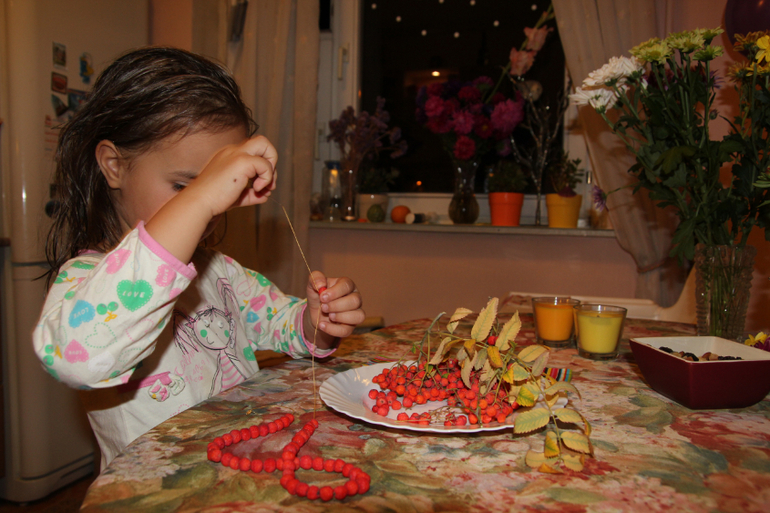 Поздним осенним вечерком сделали со старшей рябиновые бусы!