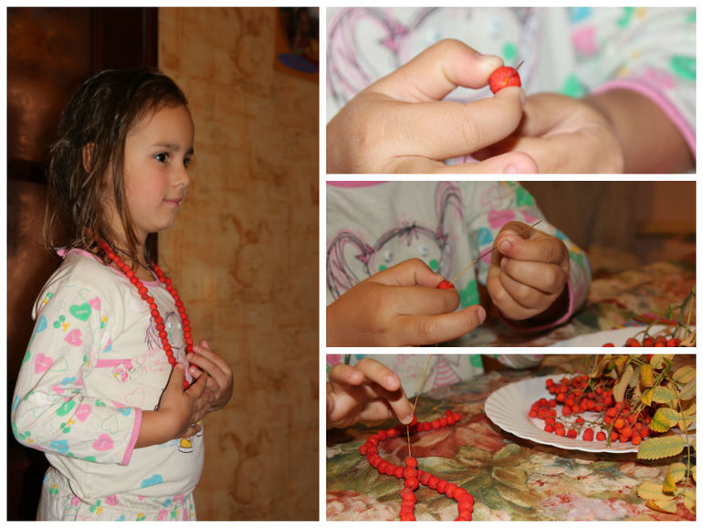 А я набрала рябину вечером, а на следующий день мы должны были из нее делать бусы, и они все "переспели" у нас, превратились в кашку. А вот рябину, которые принесли наши гости, сорвали у нас во дворе — вот из нее и получились нормальные бусы. http://www.babyblog.ru/user/id906775/218117