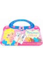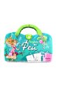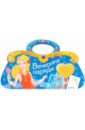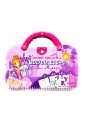 Сумочка-очаровашка, наборчик для творчества с трафаретами, наклеечками и пр. В садике у нас как раз шли поделочки, связанные с моделированием одежды, видами тканей, придумыванием платьев. Поэтому у дочки к этому наборчику возник очень сильный интерес. Он оригинально оформлен - в виде сумочки с застёжкой. Застёжка удобная, прочный пластик, и сама обложка из какого-то такого прочного материала, не бумажного. Сумочка с ручками - можно брать с собой, ходить в гости, играть с подружками.