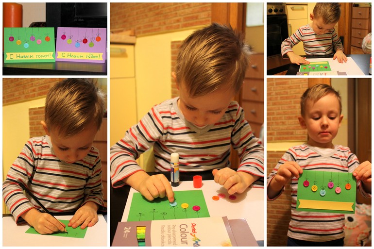 Ниточки, на которых "подвешены" пуговицы, получились неровные (Ромка очень старался, и перестарался)) обычно он рисует ровнее). Но благодаря этому, открытка приобрела забавный вид. Сразу понятно, что рисовал ребенок, и в этом её прелесть!![]()
