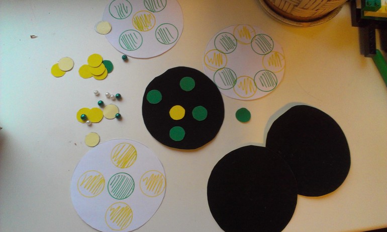 Сделать "коврики" из бархатной бумаги по образцу. Куда кладем желтый круг? в центр.