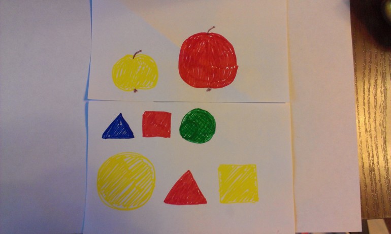 На какую фигуру похоже первое яблоко? Чем похоже, цветом или размером? Какая фигура похожа на оба яблока? Чем похожа? Круг, формой.