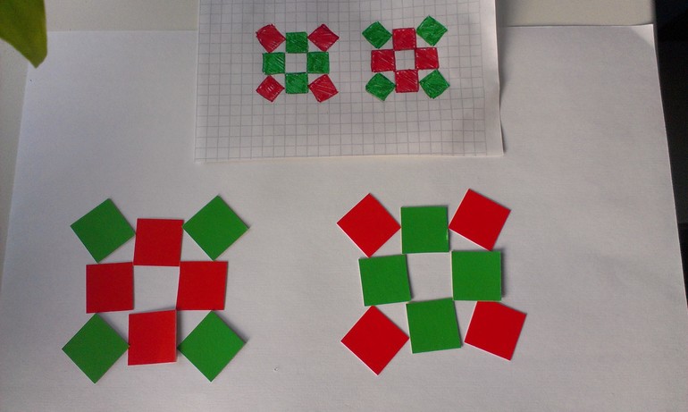 сложить из палочек. заметить,что для последней фигуры нужна четвертая палочка