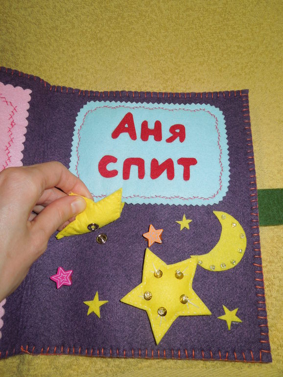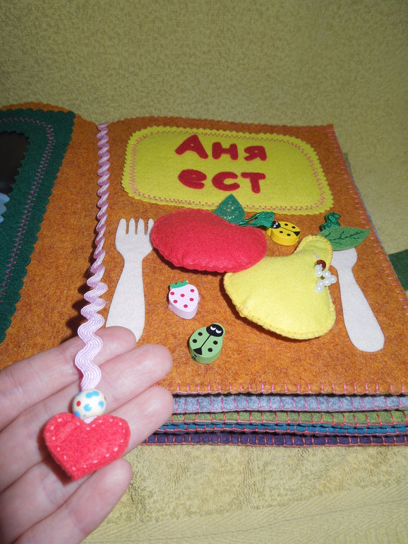 1. Книга называется: «Что делает Аня?». Для красоты пришила красную ленту и бусину в виде сердечка, такое же сердечко, только маленькое, пришила на последнюю страничку. Книга закрывается на кнопочку хлястиком.