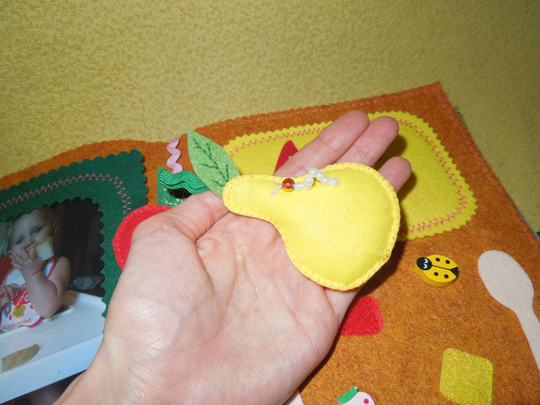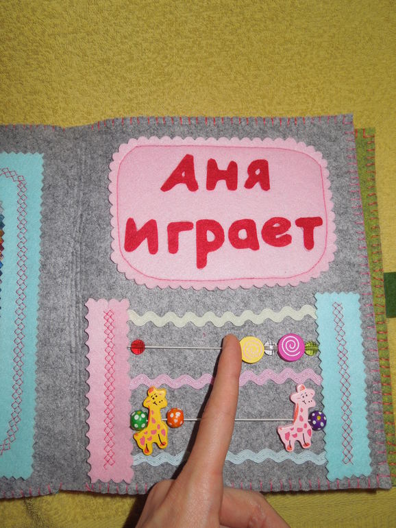 Грушка пищит при нажатии, а также пришила на грушу гусеницу из бусинок.3. Следующая страничка называется «Аня играет». На ней я сделала счеты из деревянных бусин.