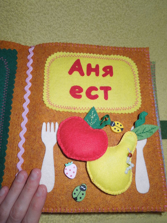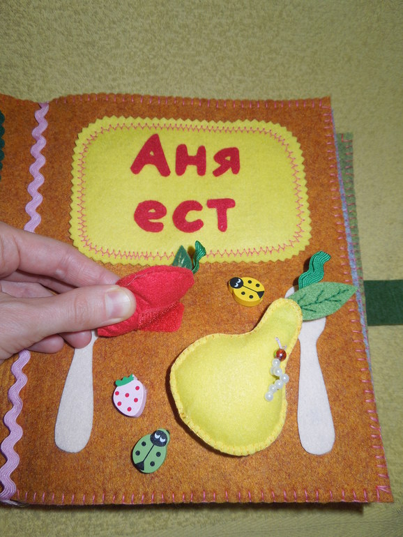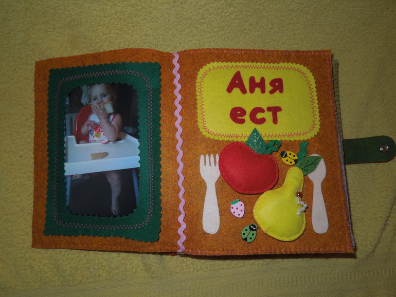 2. На каждой страничке есть отсек для фотографии ребенка, формат 10 Х 15. Тематика первой странички - еда и называется «Аня ест». На ней изобразила вилку, ложку и фруктики, для красоты пришила бусины в виде божьих коровок и клубнички.![]()