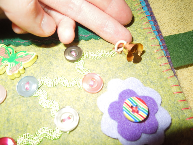 В конце каждой дорожки колокольчик и бубенчики, они взаимосвязаны с друг другом, поэтому звенят все сразу, если дернуть за одну. Деткам очень это нравится.