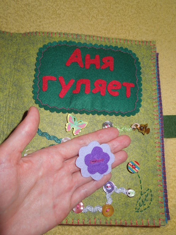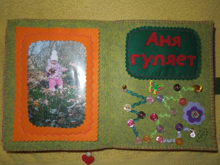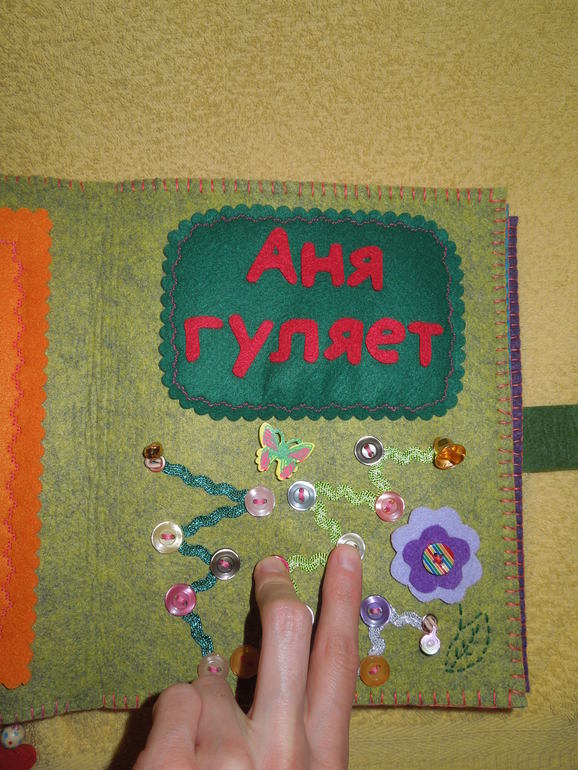 4. Страничка «Аня гуляет». На ней я сделала по методики пальчиковых дорожек три дорожки из пуговиц. Есть самая длинная дорожка, средняя и самая маленькая. На этой странички можно гулять шагать по дорожкам пальчиками, считать пуговички, изучать цвета, сравнивать длины: «Давай посмотрим, какая дорожка самая длинная, а какая короткая!».![]()