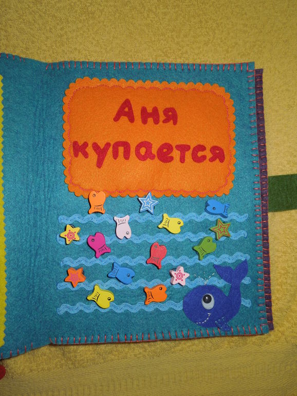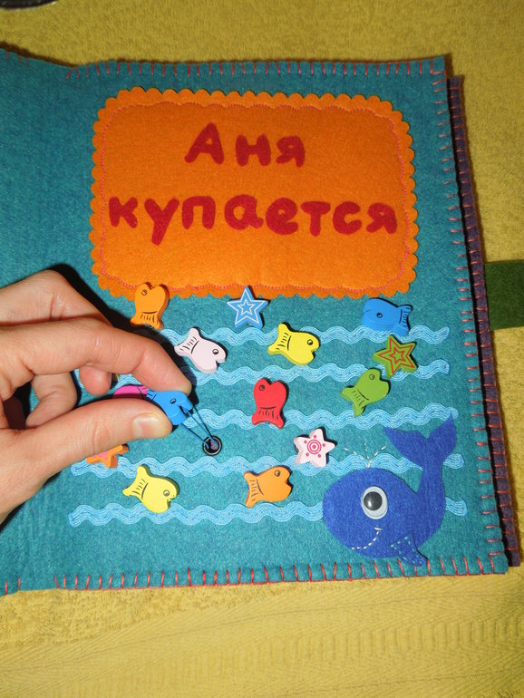 5. Страничка «Аня купается», морская тематика. В углу поселился синий кит с подвижными глазками, а вокруг его друзья - рыбки.