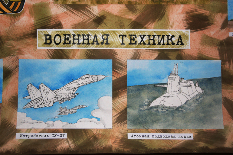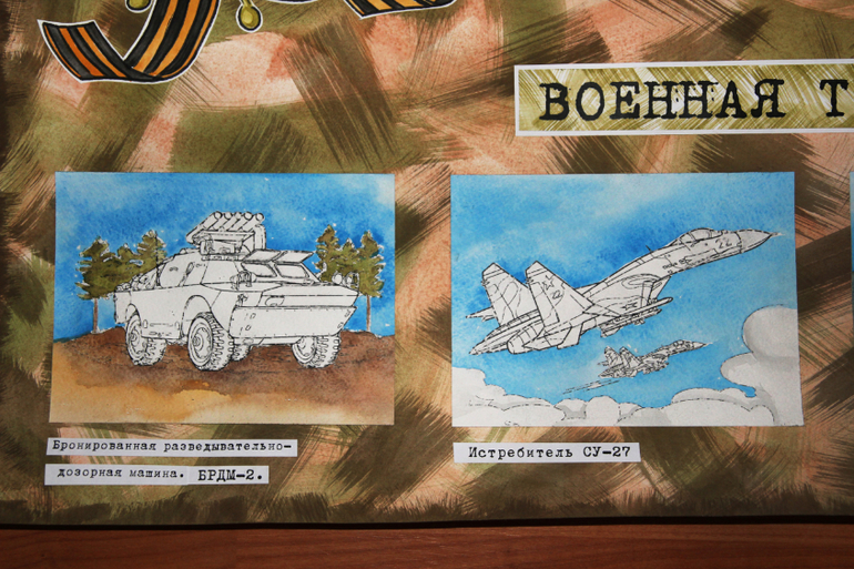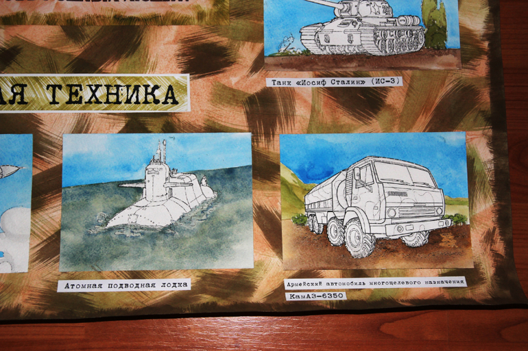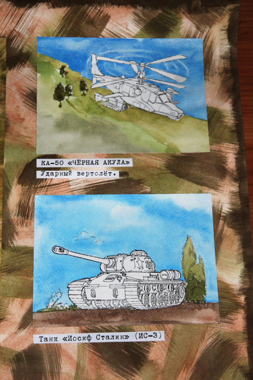 Далее я выбрала несколько видов военной техники и на акварельной бумаге раскрасила только фон, выделяя тем самым объект!!!
