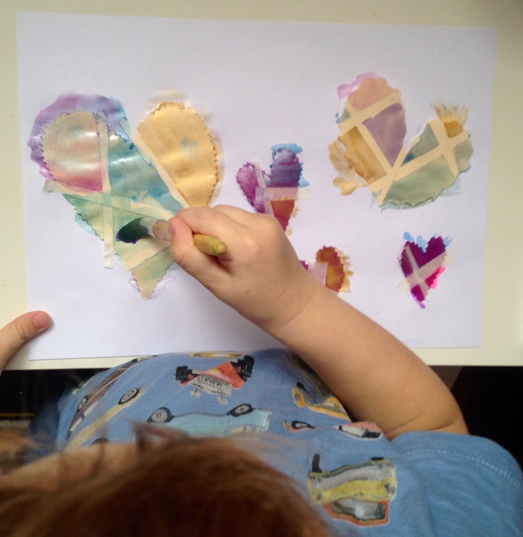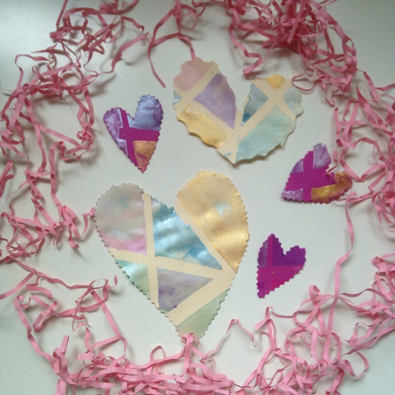 Остальные валентинки делали так: сердца заклеить малярным скотчем, оставшиеся участки закрасить, снять скотч: