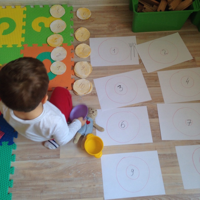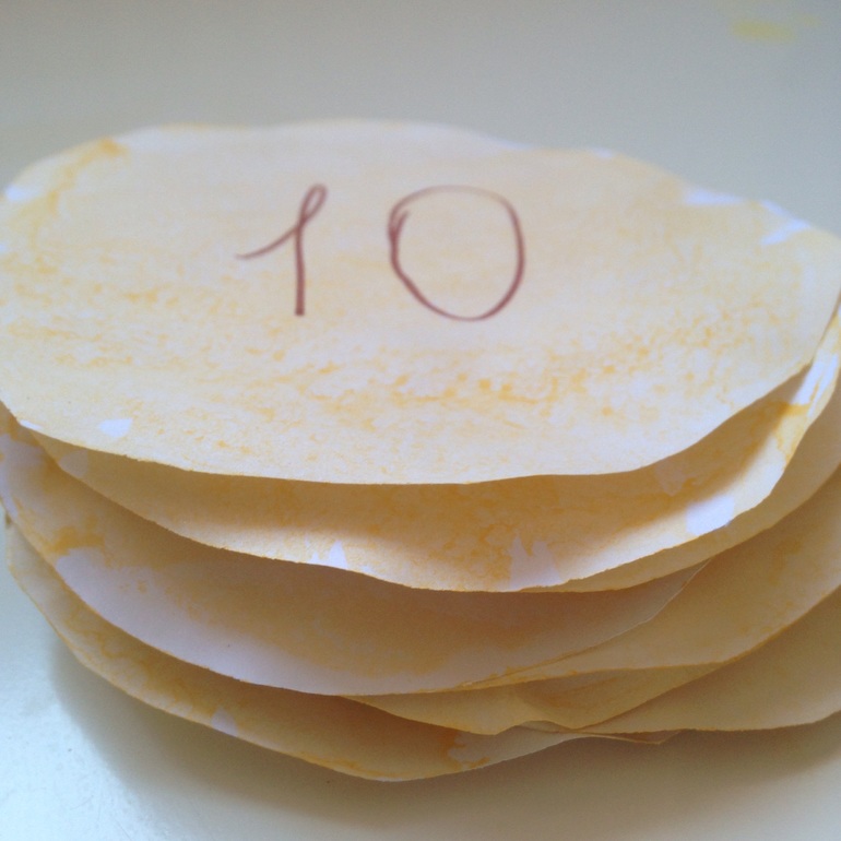 В блинную неделю делали бумажные блины , красили желтой краской, сушили на батарее-от этого они стали как настоящие неровные. Потом написала на них цифры, цель была разложить по тарелочкам нужное количество.