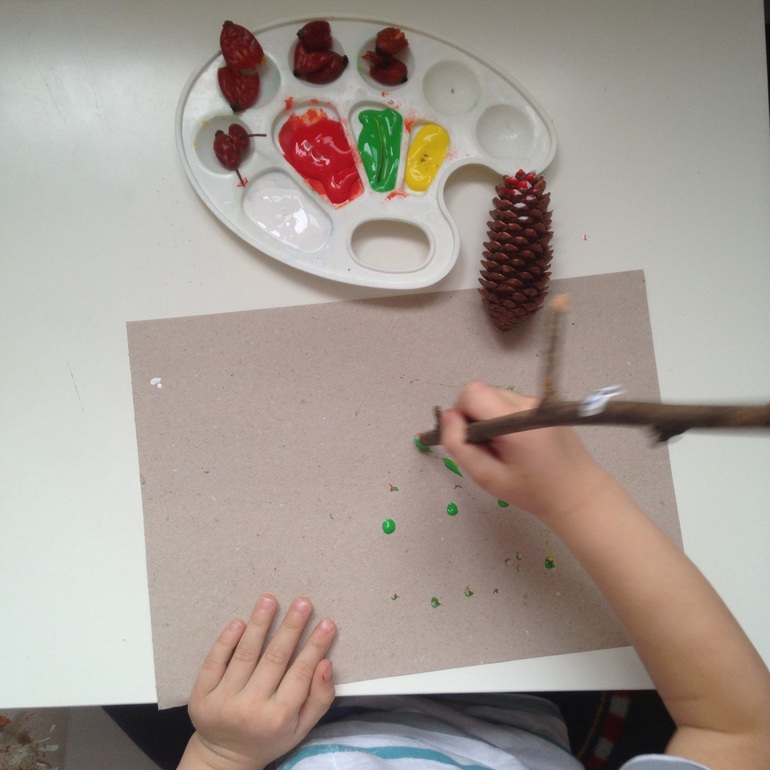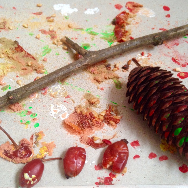 Рисунок природными материалами: отпечатки палки, шишки, шиповника, засыпал песочком)