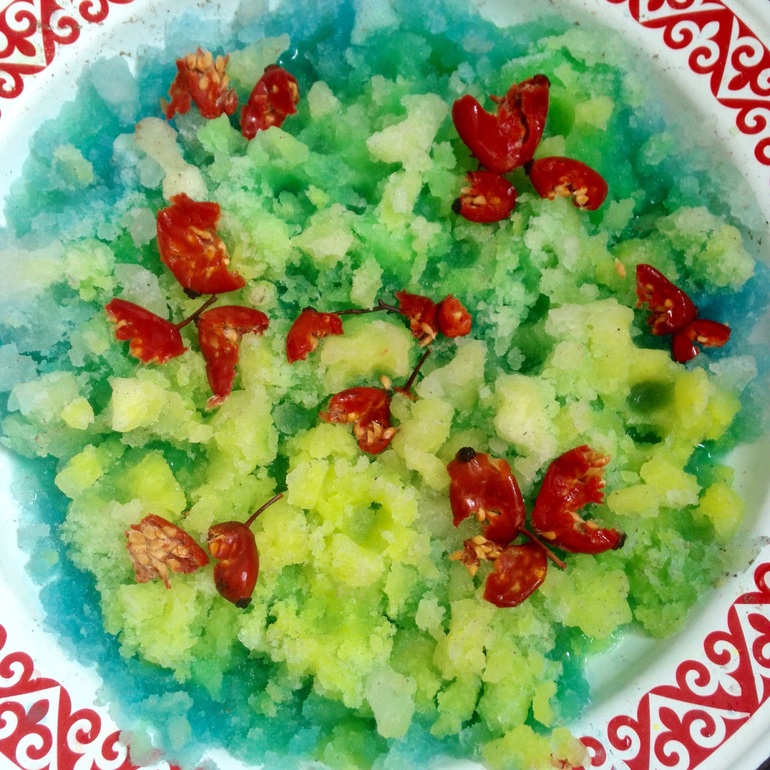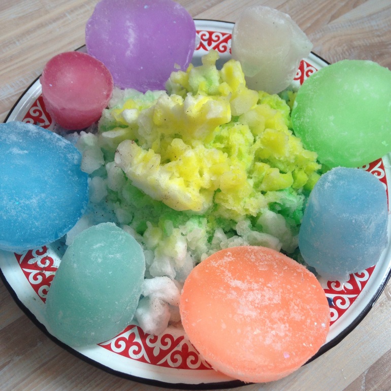 После потепления выпал снежок, и мы бросились его красить, заодно вытащили и цветной лед из морозилки.