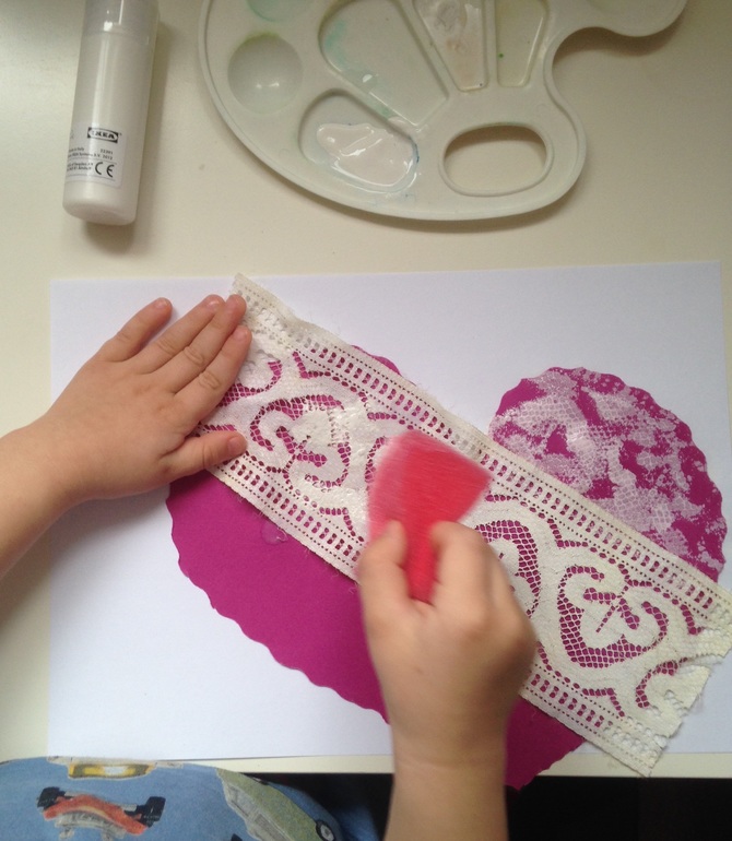 Взяли кружево, губкой наносили краску, получилась валентинка :