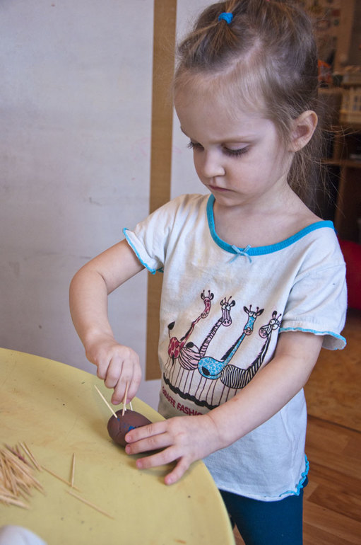 Зайчику пришлось есть бурую кору и сухие листья, которые Алиса вылепила из пластилина. Вдруг он вспомнил, о просьбе ежика! Нашел желудь (маленький камушек), и превратил его в снежный ком (манка+вода)