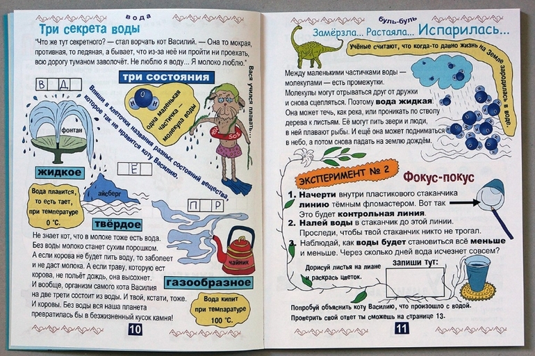 Читая эту пеструю книжку вместе со взрослым, ребенок узнает удивительные факты о животных и птицах, о воде и почве, о времени и звуках, о климате и многом другом. Ну и конечно, получит ответы на вопросы, почему дует ветер, почему вода жидкая, почему небо голубое и другие, самые частые «почему?» Различные опыты помогут лучше понять, почему после ночи наступает утро, почему весной талая вода не заливает весь город, как меняется молекула воды, превращаясь в лед и так далее. Кот Василий объяснит ребенку, как вырастить луковицу, петунию, бабочку, кристалл и даже... плесень.
