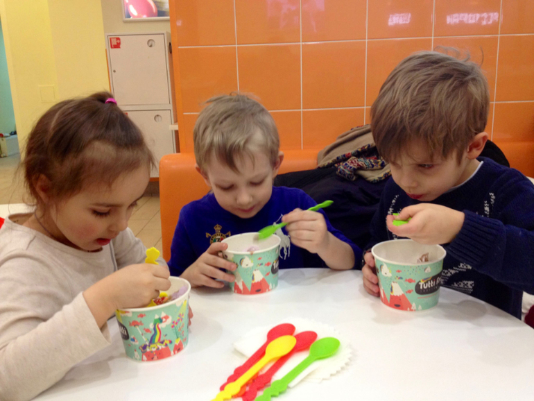 И по завершении прогулки по Арбату Настя пригласила своих друзей в ее любимое Кафе Тутти-Фрутти, где можно на свой вкус "собрать" очень вкусное мороженое!