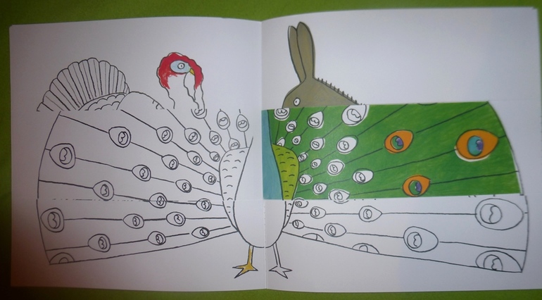 Заманчивый разворот в книге, предлагается павлина, индюка и осла собрать из разрезанных частей странички типа пазла, а также раскрасить