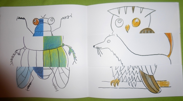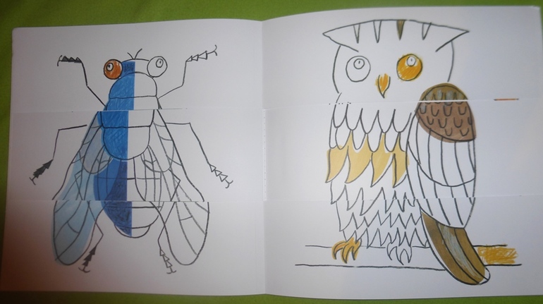 Разрезанные страницы, предлагается собрать и раскрасить 4 персонажей: жука, лису, муху и сову