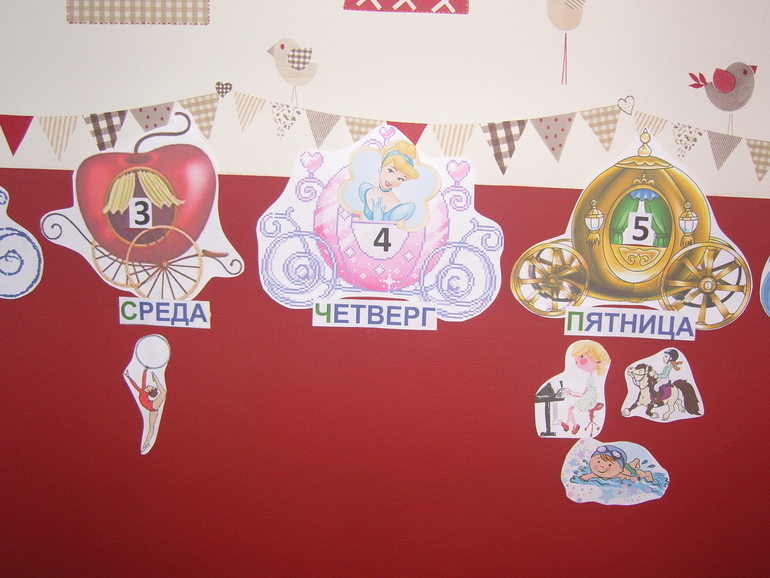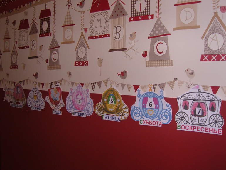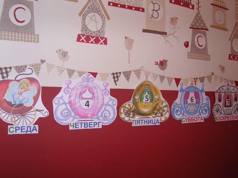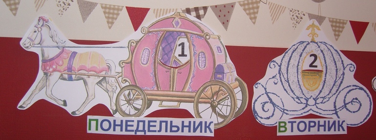 Работает календарик элементарно - ежедневно перемещаем принцессу из одной кареты в другую, читаем название дня недели (первая буква выделена зеленым для удобства дочки), выходные выделены розовым (у нас выходные от садика правда не только суббота и воскресенье, но в календаре придерживаюсь традиций).