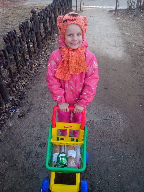 В прошлом году я задалась целесообразностью покупки детской тележки не для игры дома, а для походов в магазин. Моя мелкая с вечным "Я САМА" постоянно норовила отнять у меня продуктовые тележки.... Управляться самой понятно у неё не поучалось, а помогать ей перемещать тележку по магазину не допускалось никому кроме меня, да и то только после длительных пояснений. В итоге походы в магазин обычно делались в её отсутствие во избежание траты своих нервов, либо с продуктовой корзиной, что не всегда удобно. И вот выбор пал на тележку Полесье. Теперь знаю точно, что с походом до магазина и обратно по нашему разбитому асфальту тележка справляется на отлично, вес в 3-4 кг выдерживает без проблем. Поход в магазин с ребёнком у нас стал просто праздником, так как она сама набирает с полок всё, что я говору. Около касс сама выкладывает на ленту, а потом складывает обратно. И ребёнок всегда при деле, и у мамы на обратном пути руки свободны)))