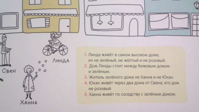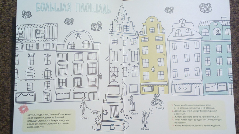 Ребенку предлагается раскрасить дома в 4 разных цвета, но предварительно решив логические задачки.
