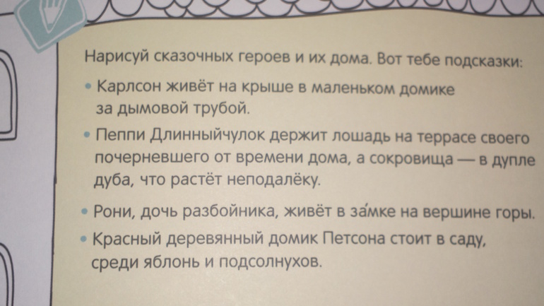 В книге есть место и для творчества. Предлагается много заданий - дорисовать детали, нарисовать свои рисунки, придумать свои знаки и символы.