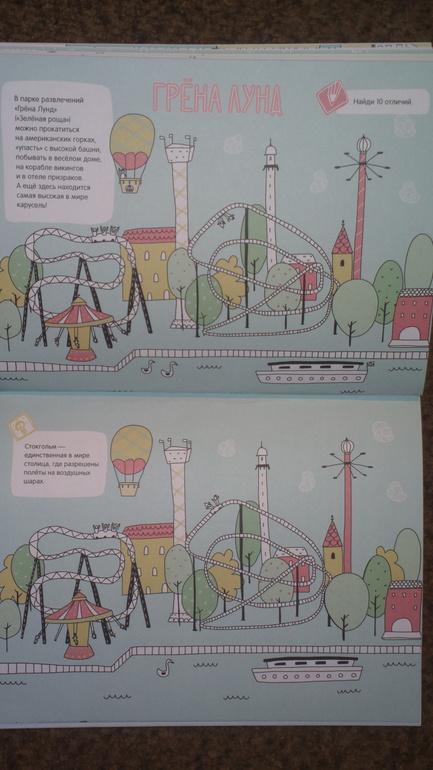 Мы с Тиграшей, окунувшись в чтение, "побывали" в парке развлечений "Грена Лаунд"- покатались на американских горках и самой высокой в мире карусели. Нашли 10 различий на данном развороте:
