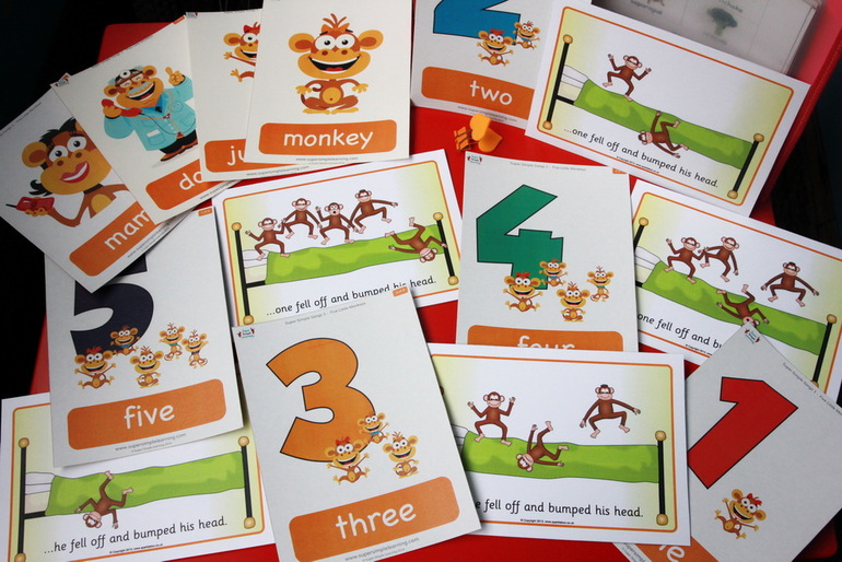 7. Five Little Monkeys. Эту песню отнести к подборке можно с большим натягом. Но это выбор Насти: она случайно услышала её среди разнообразных видео и многократно просила повторить. А в таких случаях я немедленно подхватываю интерес, поэтому мы нашли для неё аж два комплекта карточек, много-много пели и изображали. Песня веселая и в отличие от многих выше приведенных не столь простая: изучается счет от 5-и до 1-го (в обратном порядке), глаголы to jump, bump, call, say, fall off - полезная песенка.