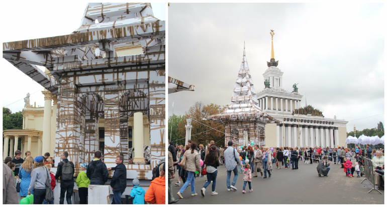 Далее можно было принять участие в строительстве фантазийного здания из коробок и скотча под руководством французского архитектора Оливье Гросстета. Мы прошли мимо.