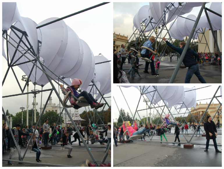 За Центральным павильоном расположились высокие воздушные качели. Была очередь 2-5 человек.
