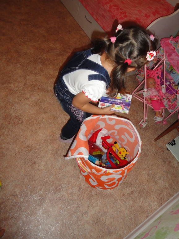 Игра "Собери сумку в садик". Ставлю большую корзинку и в неё разные предметы нужные и ненужные. Включаю музыку. Катя на скорость носит по одному предмету в сумочку. Потом проверяем все ли предметы нужные. У нас оказались лишними крем и шампунь)))