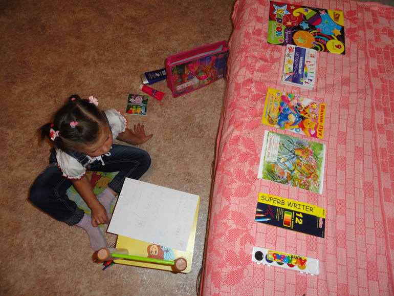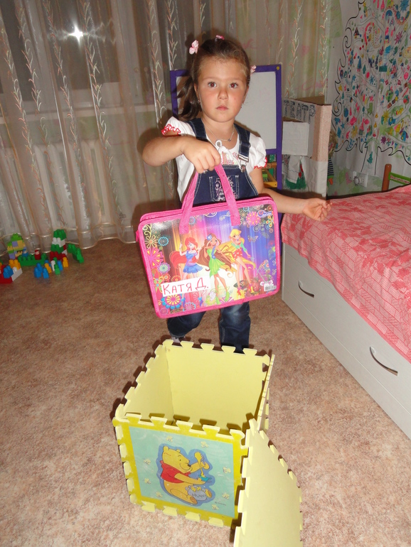 Но начиналось все с сюрприза-загадки. Воспитатели сказали купить папку-сумочку и сложить в неё всю канцелярию. Она и стала сюрпризом. Спрятала я её в кубик из пазла и предложила Кате отгадать.