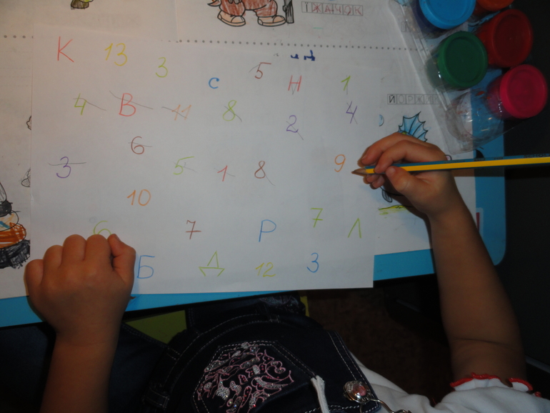 1 подсказка. Угадай букву, с которой начинается слово. Она спряталась среди цифр и других букв. Условие: она не красного цвета, не внизу. Я думала, Кате будет сложно, но она сразу смекнула, что нужно зачеркнуть цифры и красные буквы. Так и нашла - буква С.